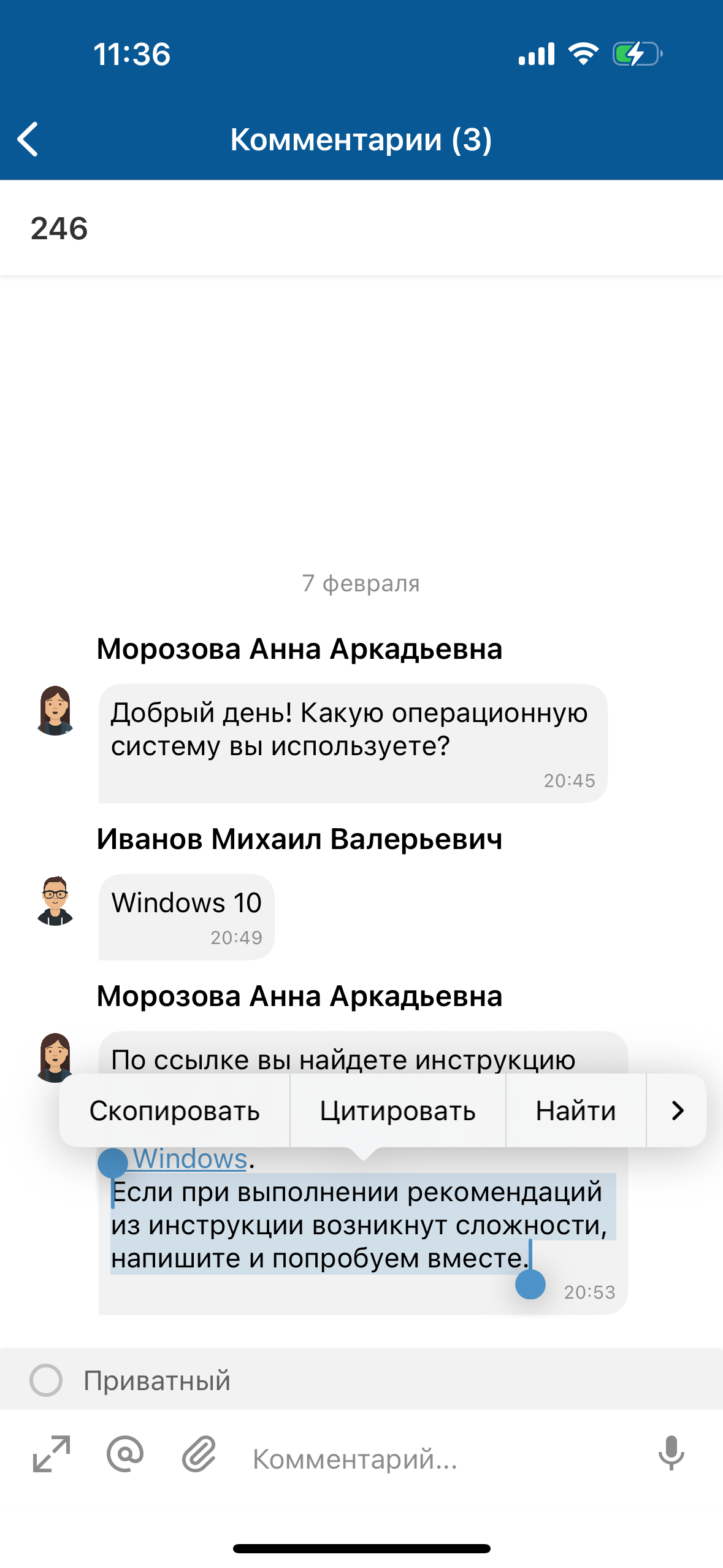 . При выходе с экрана добавления комментария без публикации, режим ответа на цитату сбрасывается и введенные данные не сохраняются. - Нажмите иконку "Отправить комментарий".