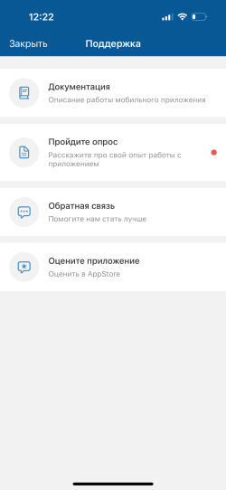 На экране "Поддержка" пользователь может: перейти в документацию, пройти опрос на лендинге, оставить обратную связь через форму, поставить оценку в магазине приложений.
