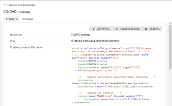 • Конфигурация в XML-виде — вводится содержание xml-файла конфигурации импорта, который определяет параметры загрузки в систему данных из внешних источников (внешней системы или файла), см. Скрипт конфигурации импорта.