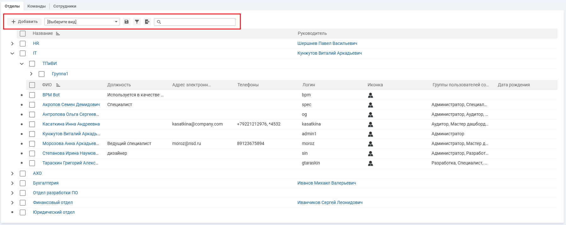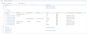 Если для списка применен пользовательский вид или переопределен системный (например, изменена ширина колонки или сортировка), то при изменении настроек системного вида они применяются только при выборе пользователем — "[Выберите вид]". - Выполнение массовых операций в списке — в каждом из вложенных списков иерархического дерева может выполняться действие с набором элементов списка. Панель массовых операций разворачивается при установке флажка рядом с хотя бы одним элементом списка. В списке можно выбрать только объекты одного класса. Подробное описание выполнения массовых операций приведено в разделе Массовые операции с объектами списка.