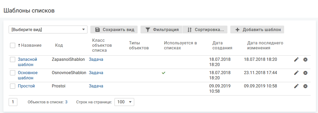 Для каждого шаблона отображаются: название, уникальный код, класс объектов списка (является ссылкой на класс объекта), типы объектов списка, отметка "используется в списках", дата создания и дата последнего изменения, а также панель иконок управления шаблоном и .