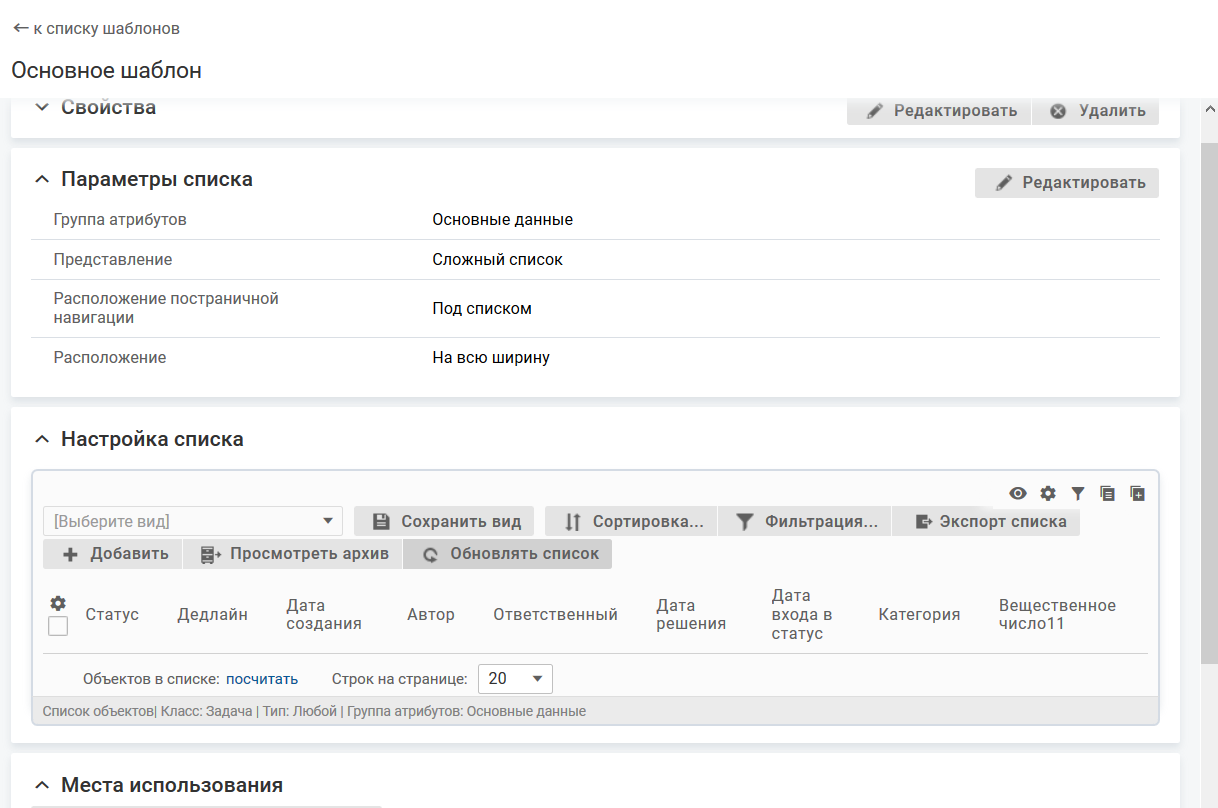 • Блок "Места использования", в котором отображаются списки, использующие хотя бы одну группу настроек данного шаблона.