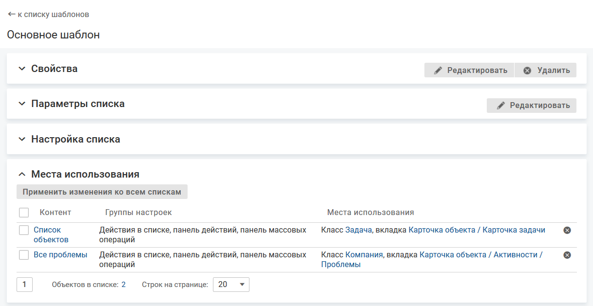 2. Откройте карточку шаблона списка и нажмите кнопку Применить изменения ко всем спискам в блоке "Места использования". Настройки всех списков, использующих шаблон, будут изменены.