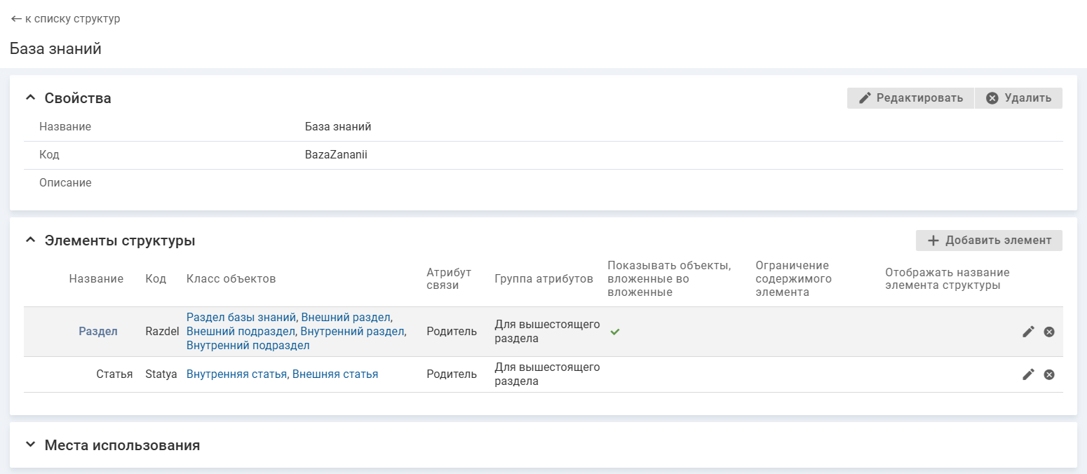 Места использования — перечисляются все настройки, где используется структура: