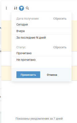 На панели уведомлений нажмите иконку Фильтрация и выберите условия фильтрации. Условия фильтрации по дате получения и по статусу объединяются по И.