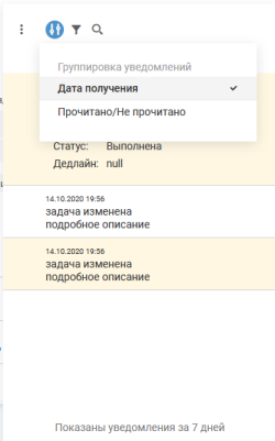 На панели уведомлений нажмите иконку Группировка уведомлений и выберите вариант группировки уведомлений: "Дата получения" или "Прочитано /Не прочитано".