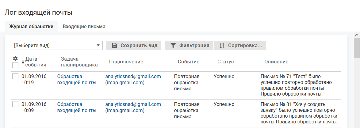 Чтобы просмотреть журнал обработки почты, в меню навигации выберите "Почта" → настройка "Лог входящей почты".