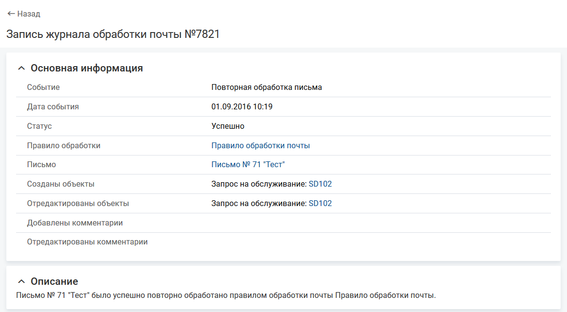 • Описание — описание результатов обработки письма, текст зависит от события, к которому относится соответствующая запись обработки.