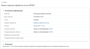 Информация о каждой записи журнала обработки содержится в карточке записи. Название карточки записи формируется по правилу: "Запись журнала обработки почты (номер записи)". Содержание записи не редактируется. Набор атрибутов на карточке записи зависит от типа события.