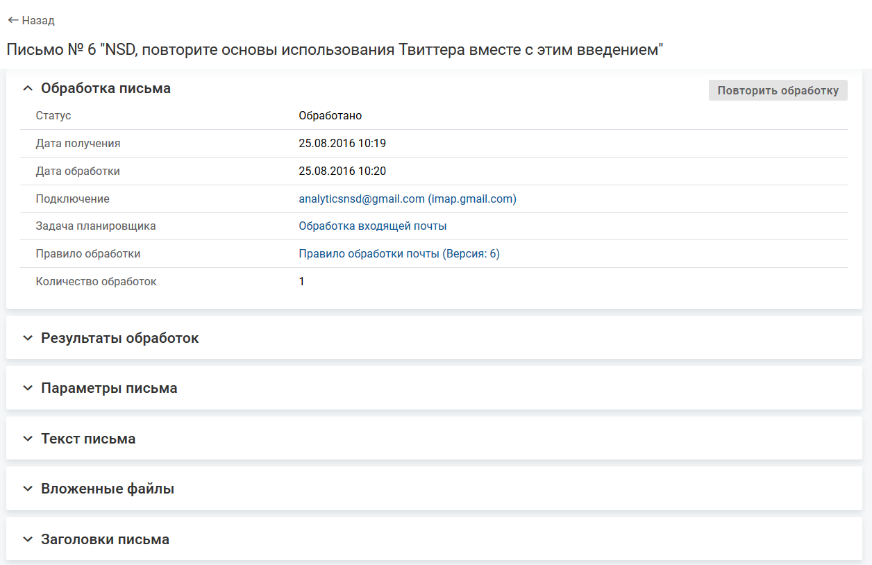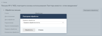 В карточке письма нажмите кнопку Повторить обработку.