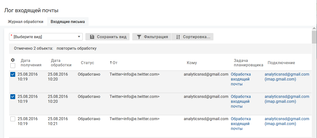 На вкладке "Входящие письма" установите флажок в строке письма для повторной обработки.