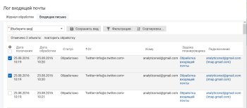 В меню навигации выберите "Настройка системы" → "Почта" → "Лог входящей почты" и перейдите на вкладку "Входящие письма".