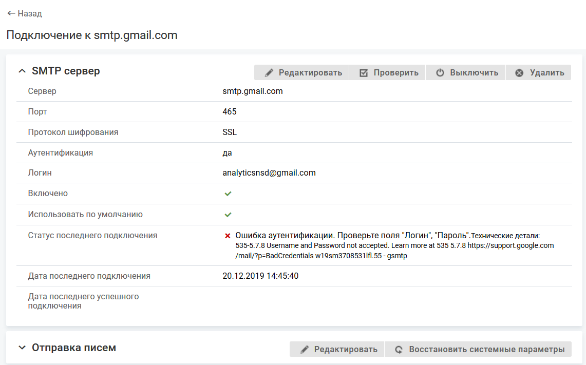 2. В блоке "SMTP сервер" нажмите кнопку Проверить. Выполнится запуск проверки подключения.