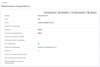 Выполнится запуск проверки подключения. Результаты проверки отображаются в карточке подключения и списке подключений (на вкладке "Входящая почта").