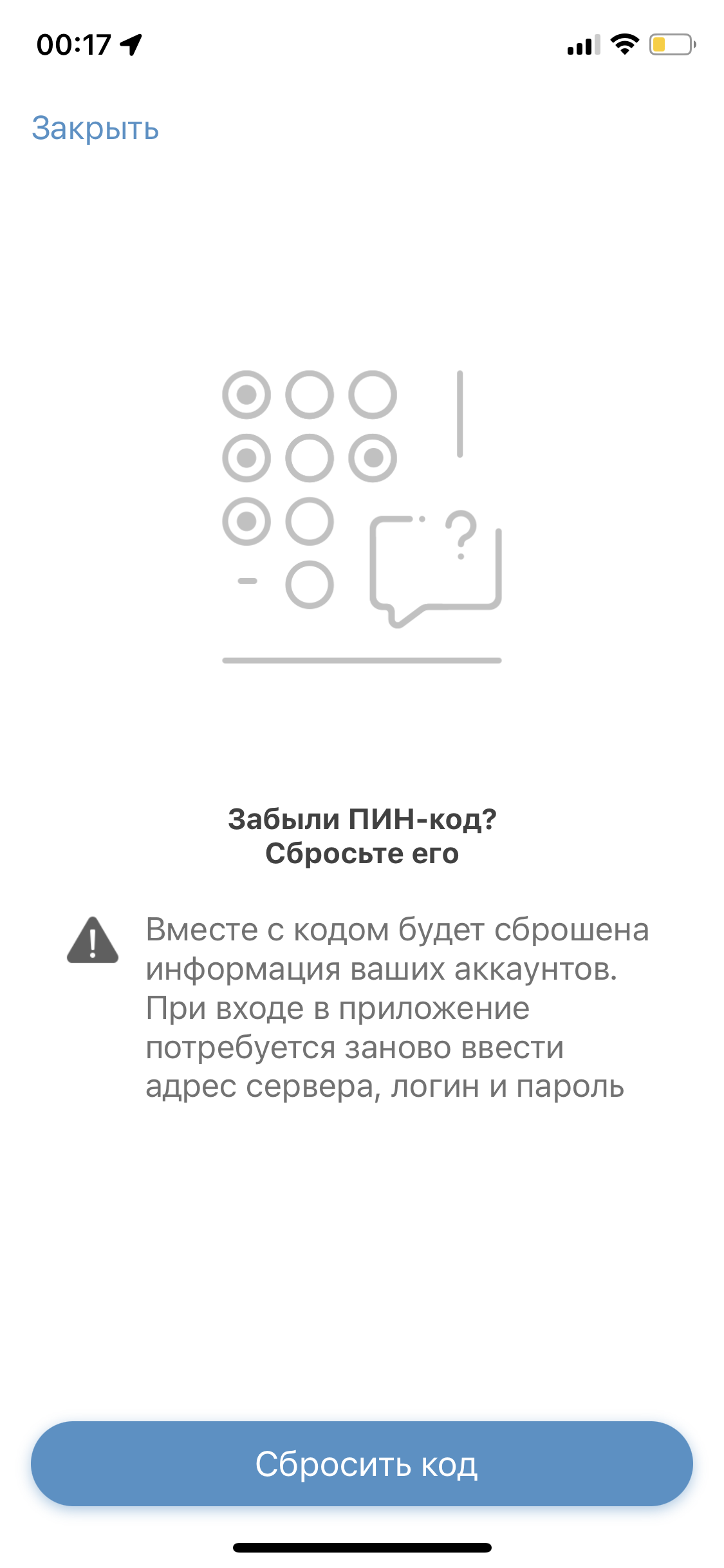 При сбросе ПИН-кода удаляются все данные приложения, кроме адреса сервера последнего активного аккаунта и очереди синхронизации.