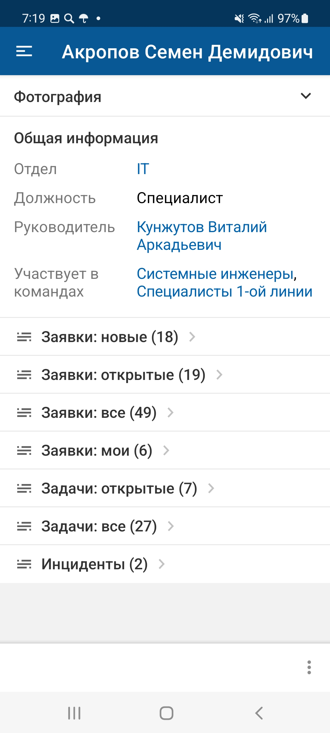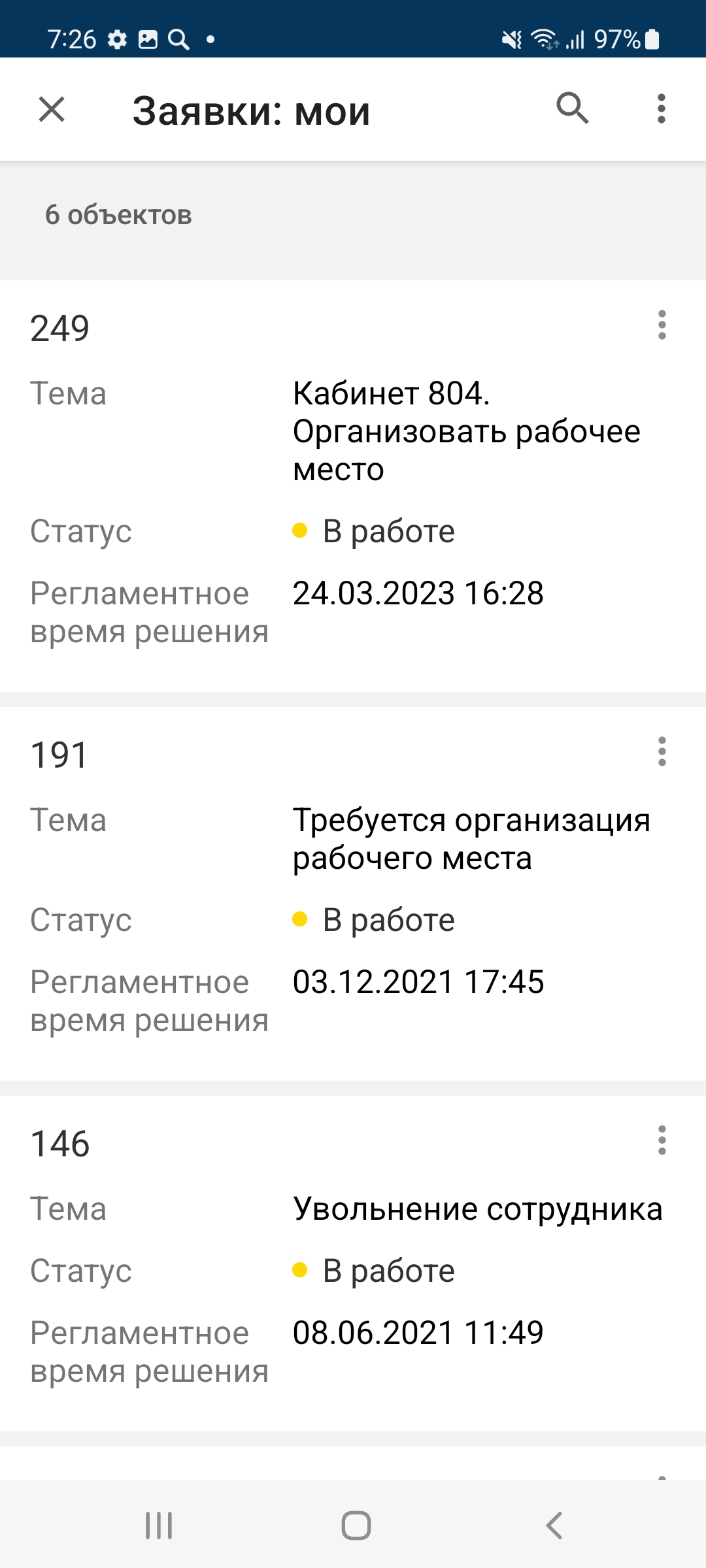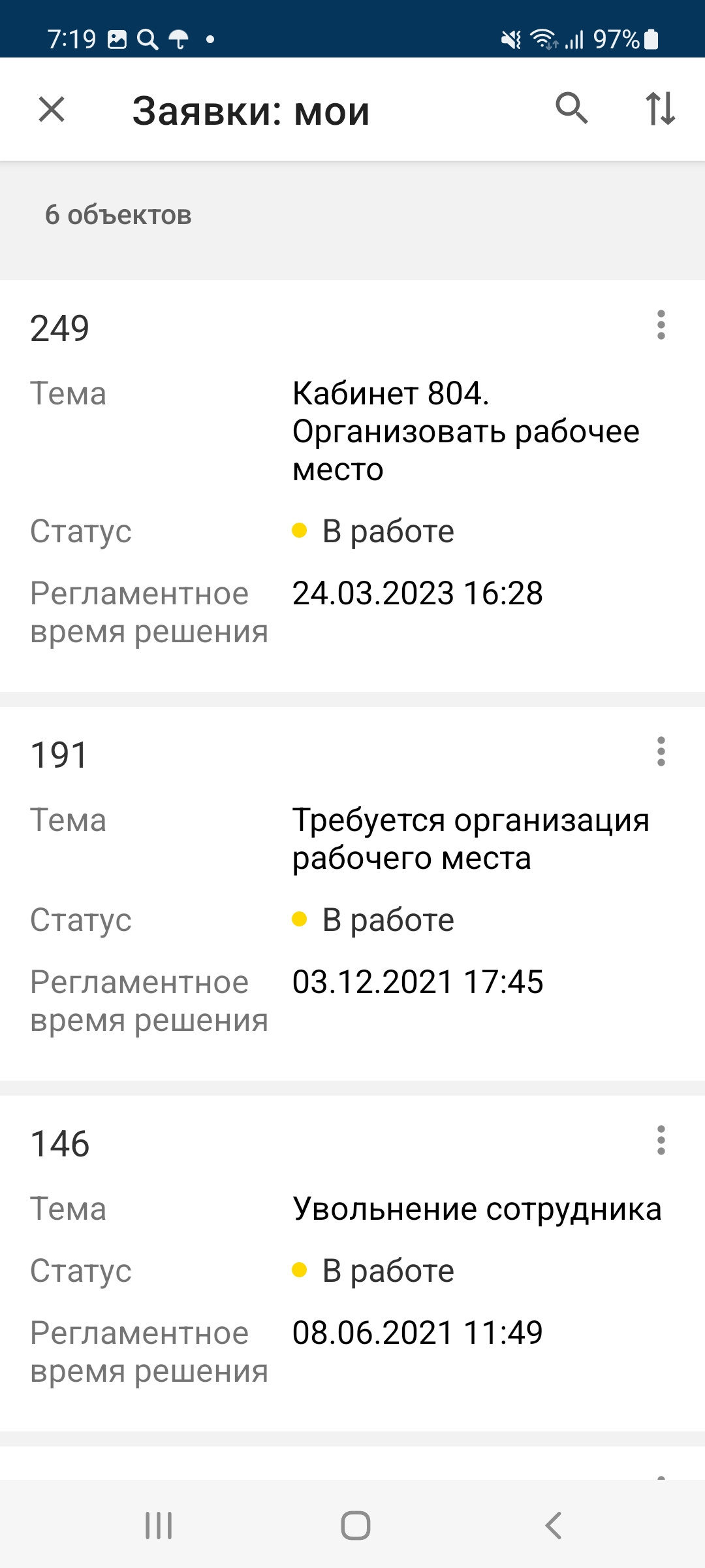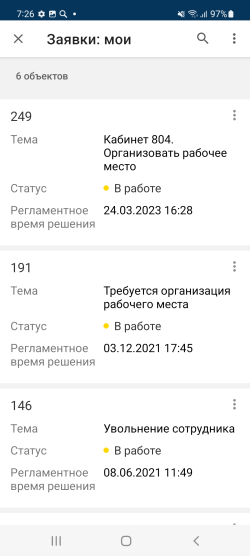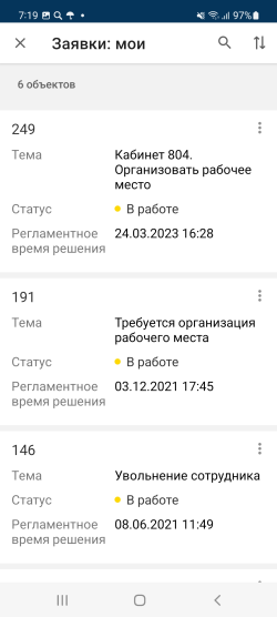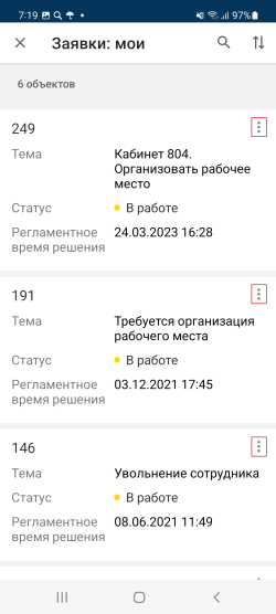 Чтобы выполнить действие с объектом, нажмите иконку вызова меню рядом с элементом списка и выберите пункт меню. Если у пользователя нет прав ни на одно действие с объектом, отображается сообщение "Нет доступных действий".
