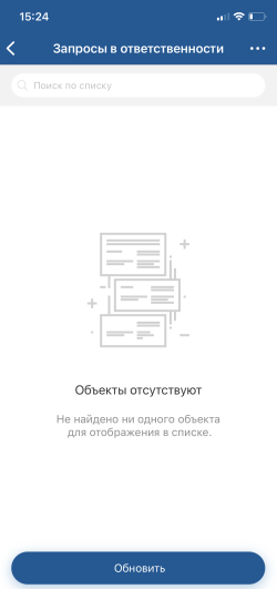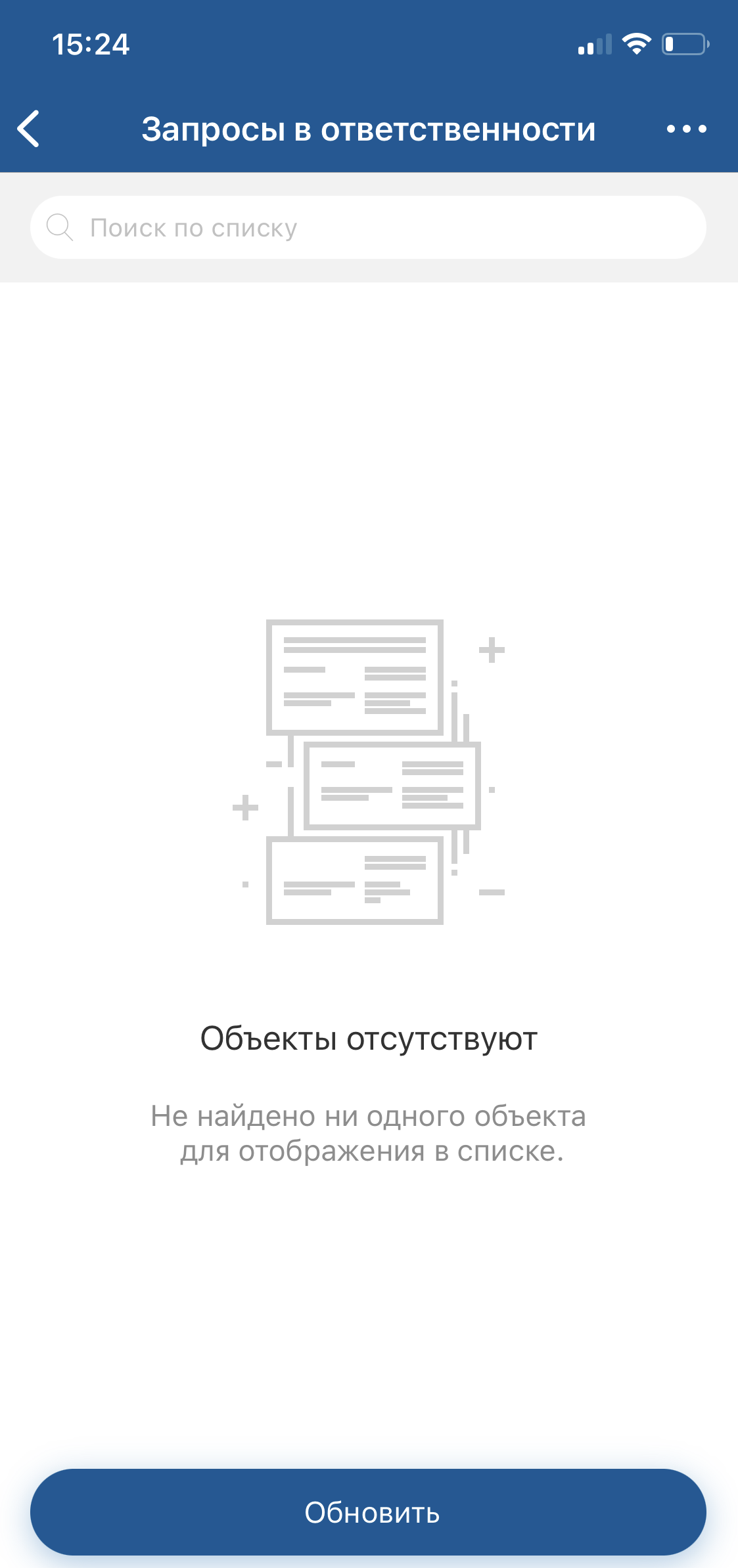 Если в списке нет ни одного объекта, на экране отображается сообщение "Объекты отсутствуют".