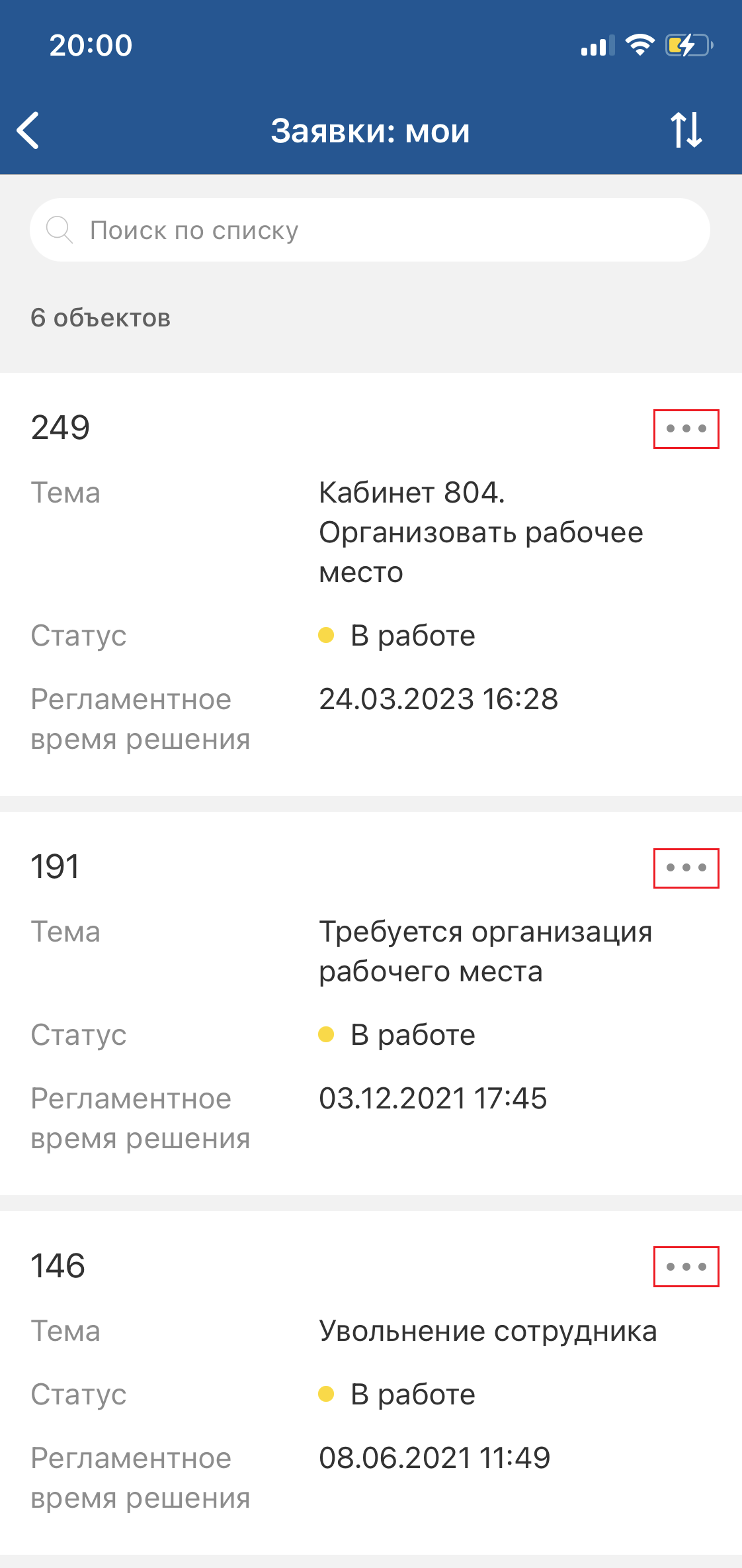 Чтобы выполнить действие с объектом, нажмите иконку вызова меню рядом с элементом списка и выберите пункт меню. Если у пользователя нет прав ни на одно действие с объектом, отображается сообщение "Нет доступных действий".