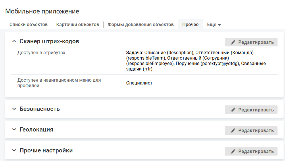 При настройке мобильного приложения можно ограничить видимость кнопки сканирования штрих-кода для некоторых пользователей.