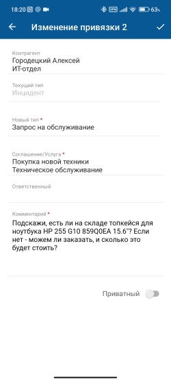 на верхней панели справа. Текст комментария отобразится в поле комментария на экране "Изменение привязки".Чтобы отметить комментарий как приватный, нажмите иконку приватности в поле комментария справа. Иконка приватности изменит цвет (комментарий приватный).