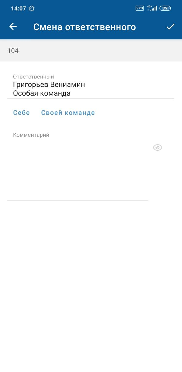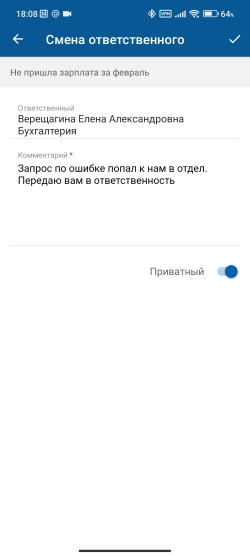 на верхней панели справа. Текст комментария отобразится в поле комментария на экране "Смена ответственного".Чтобы отметить комментарий как приватный, нажмите иконку приватности в поле комментария справа. Иконка приватности изменит цвет (комментарий приватный).