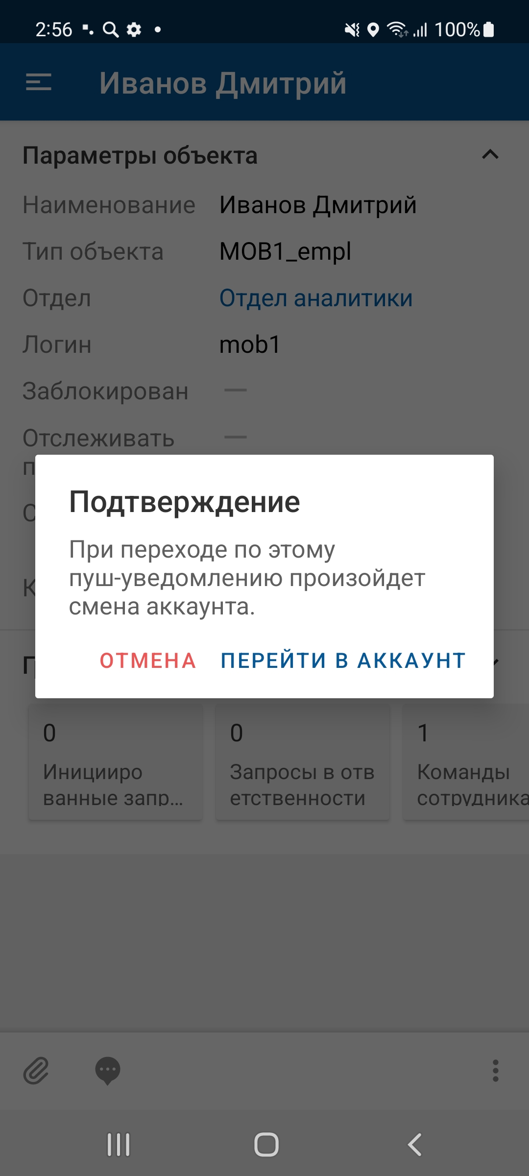 Чтобы сменить активный аккаунт по пуш-уведомлению, нажмите на уведомление и на виджете подтверждения смены аккаунта выберите "Перейти в аккаунт".