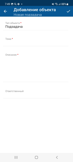 На экране добавления заполните значения атрибутов объекта. Набор атрибутов зависит от настройки мобильного приложения.