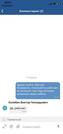На экране отображаются комментарии, добавленные в мобильном приложении (на экране "Комментарии ()", на формах смены статуса, смены ответственного, смена типа и привязки) и в веб-интерфейсе.