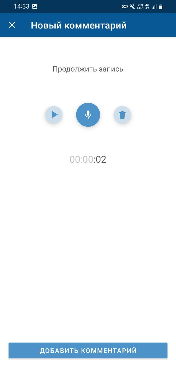 После остановки записи голоса, можно продолжить запись, прослушать запись, удалить запись или создать комментарий.