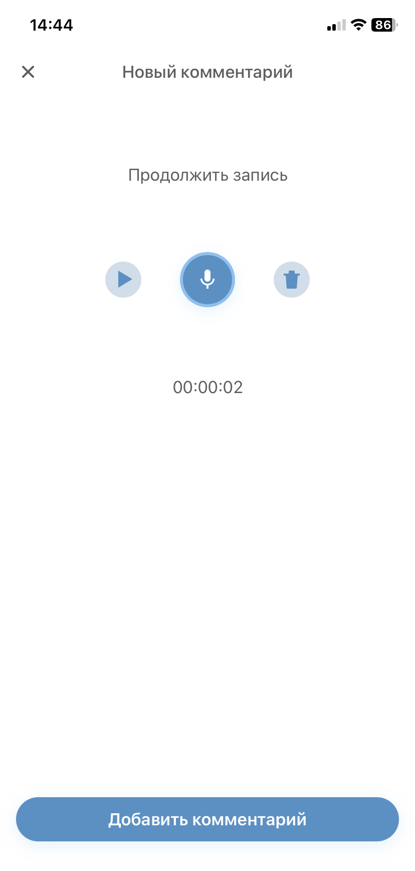 В мобильном приложении добавить комментарий можно двумя способами: с использованием голосового ввода или путем ввода текста с клавиатуры вручную. Описание ввода комментария вручную приведено в разделе Добавление комментария вручную. iOS.