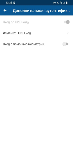Набор отображаемых параметров зависит от наличия соответствующей возможности у мобильного устройства. Если устройство поддерживает биометрические механизмы аутентификации, но они не соответствуют стандартам безопасности, необходимым для работы мобильного приложения, то настройка входа с помощью биометрии невозможна.