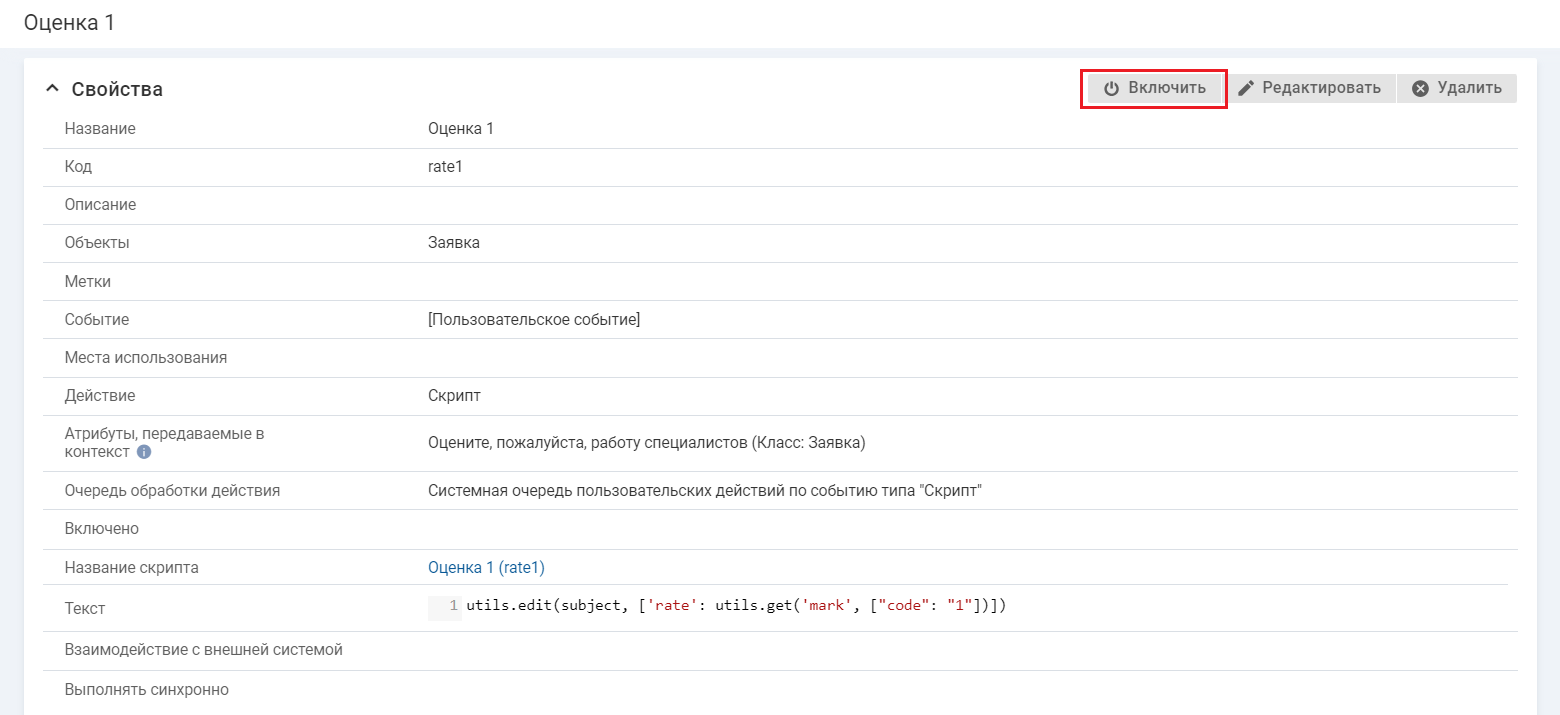- Действие — "Оценка 1".
