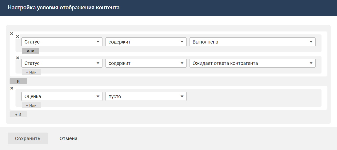Условия отображения контента — настройте условия, при которых возможность оценить запрос будет доступна на его карточке, например, если запрос находится в статусах "Выполнен", "Ожидает ответа контрагента" и оценка за запрос не выставлена.
