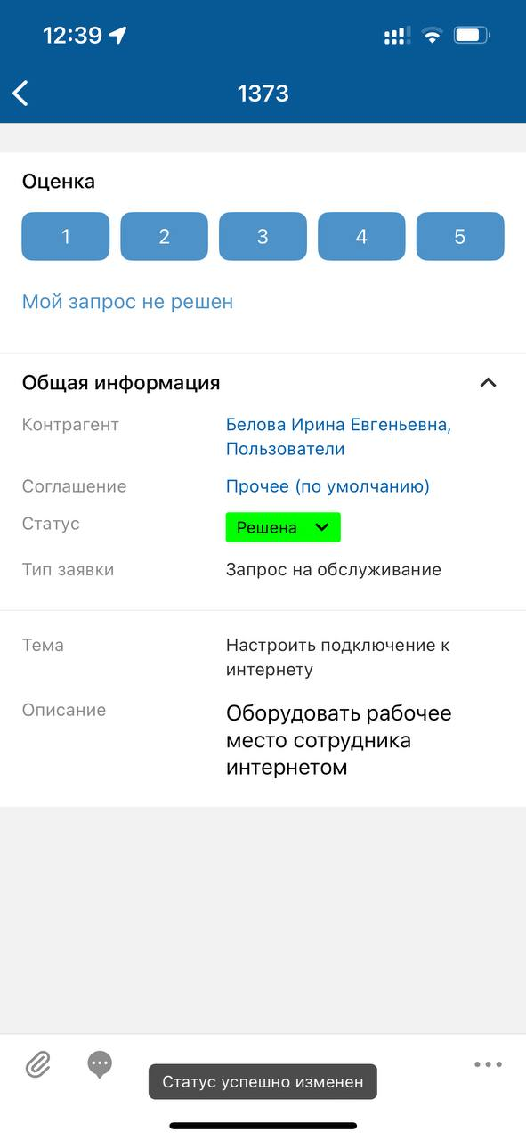 На карточке запроса в статусе "Решена" отображаются кнопки для оценки выполнения запроса.