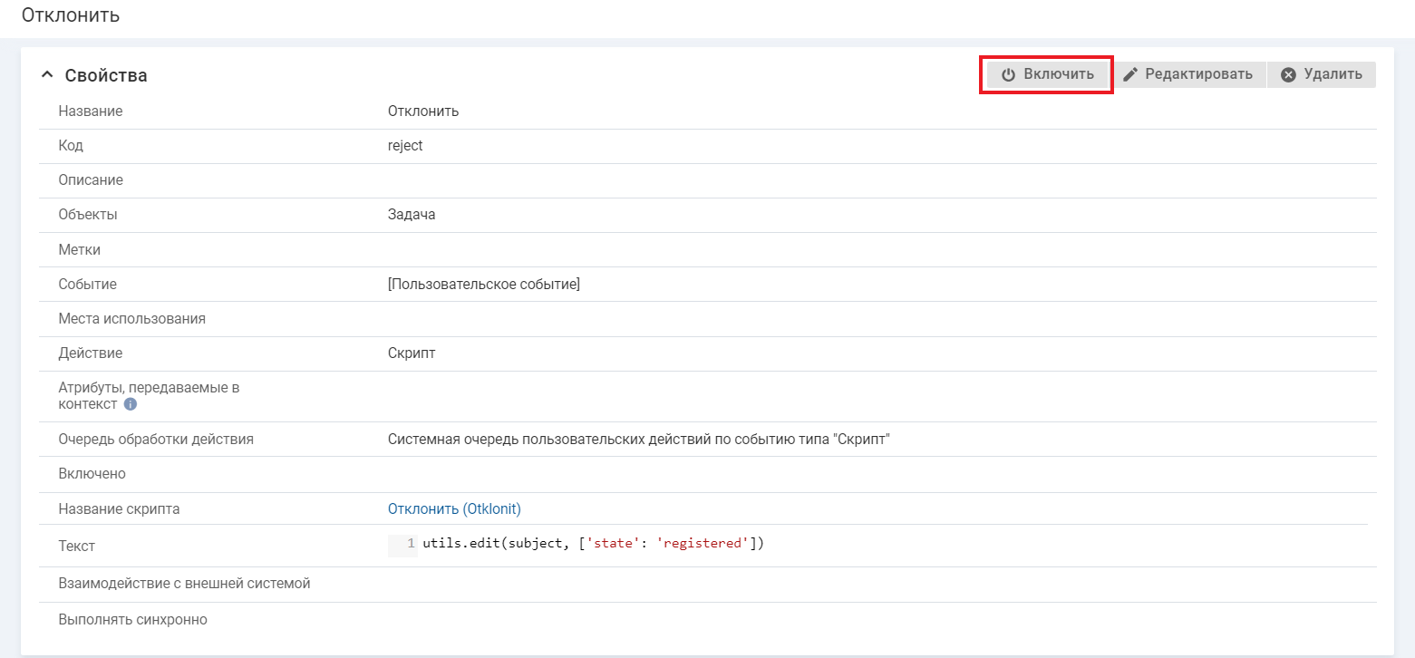 Параметры действия "Отклонить":