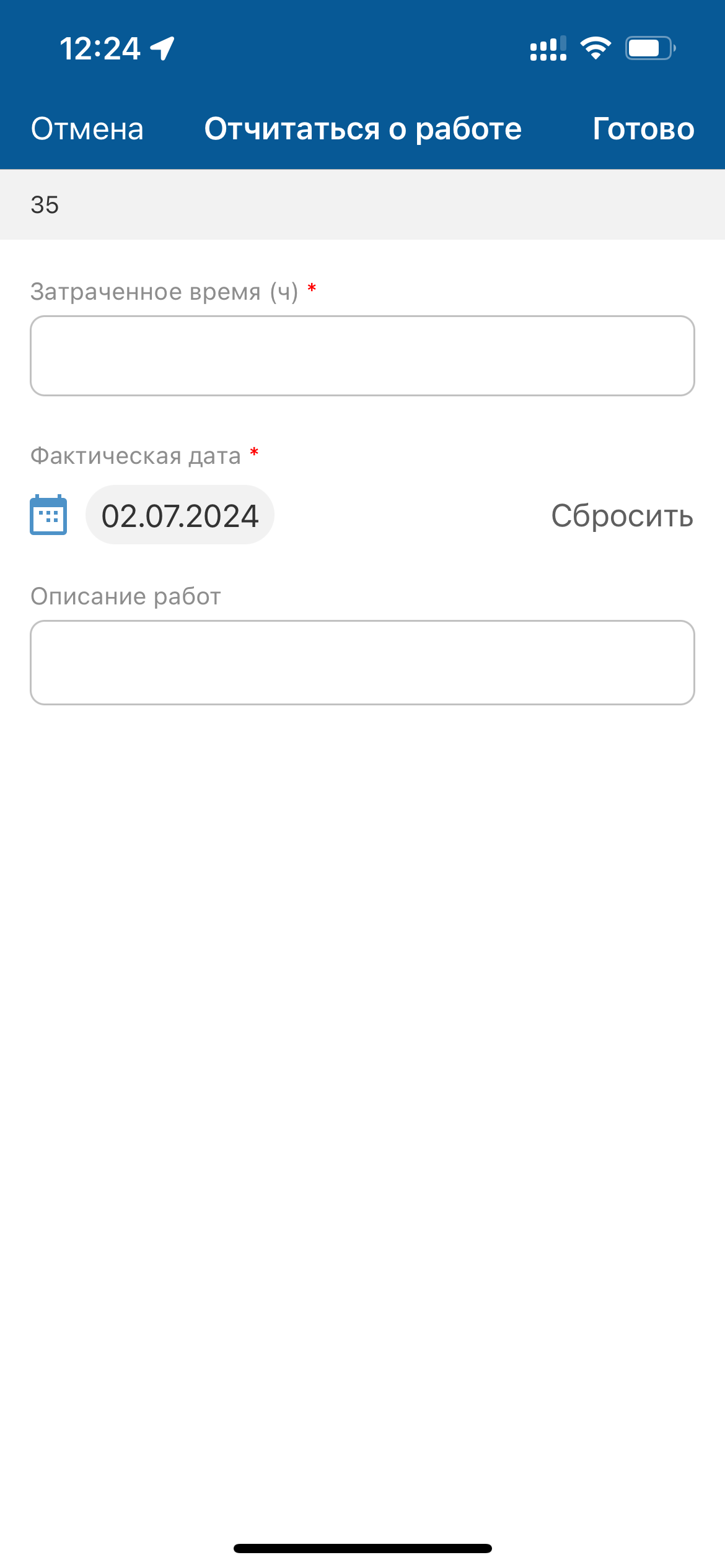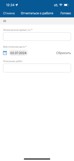 На карточке задачи отображается кнопка Отчитаться о работе, при нажатии на которую открывается экран с полями для отчета о выполненной работе.