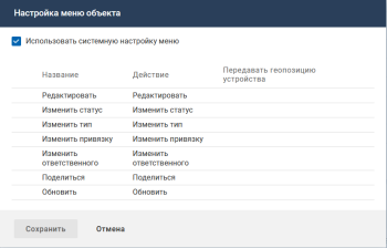 4. Нажмите кнопку Сохранить на форме "Настройка меню объекта".