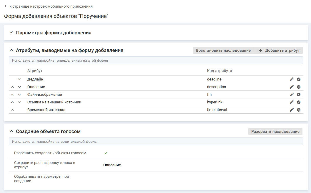 Меню навигации "Настройка системы" → настройка "Мобильное приложение" → вкладка "Формы добавления объектов" → страница настройки формы добавления в мобильном приложении → блок "Создание объекта голосом".