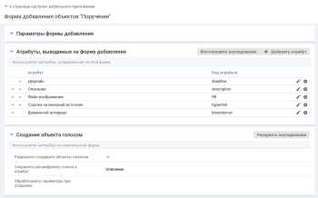 Флажок включен — в мобильном приложении возможно голосовое создание объектов. В меню мобильного приложения справа от названия кнопки добавления будет отображаться иконка микрофон и на форме добавления объекта будет отображаться кнопка Создать голосом, при нажатии на которые будет открываться форма голосового создания.