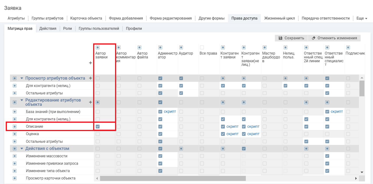 Чтобы восстановить настройки матрицы прав до внесения изменений, нажмите кнопку Отменить изменения. Чтобы сохранить новые настройки прав, нажмите кнопку Сохранить. Карточка класса/типа объектов обновится.