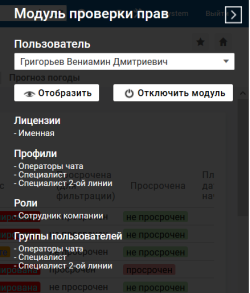 Чтобы развернуть панель модуля проверки прав, в интерфейсе оператора нажмите иконку "Открыть модуль проверки прав" на верхней панели справа (