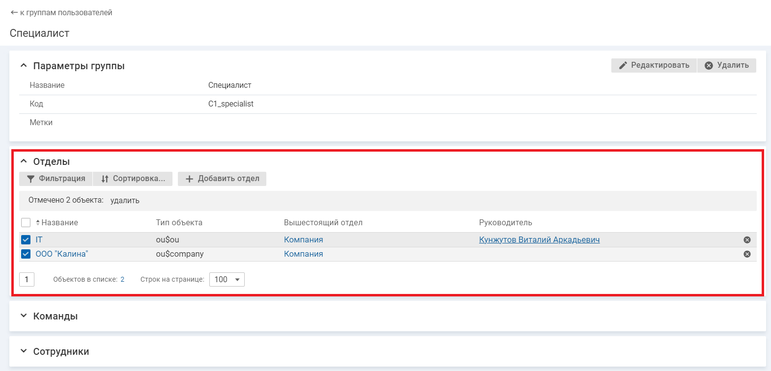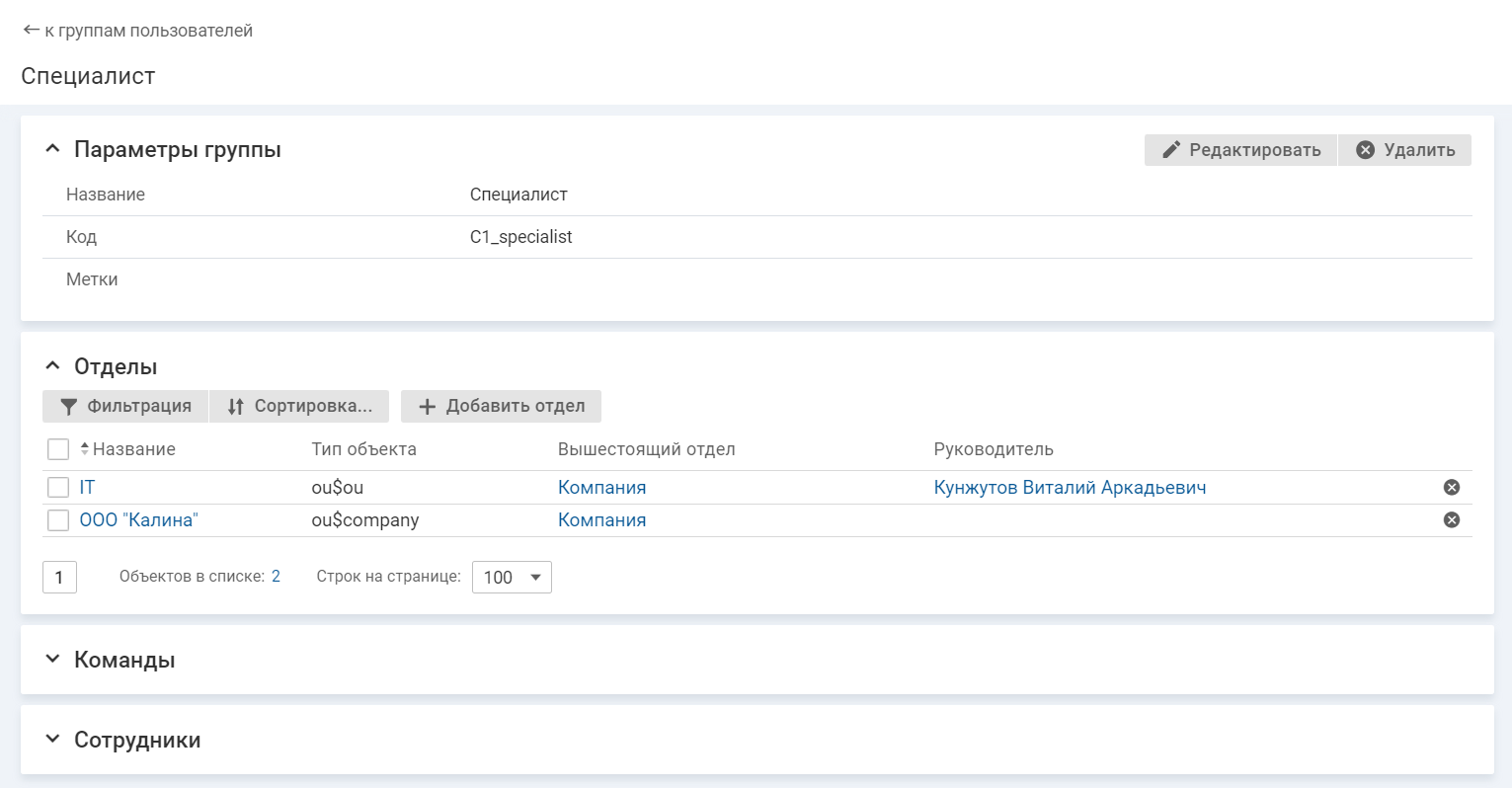 1. Откройте карточку группы пользователей. Отделы, команды и сотрудники, входящие в группу пользователей, отображаются в отдельных списках.