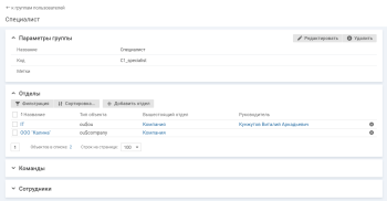 • блок "Отделы" содержит список отделов, входящих в состав группы. Все сотрудники указанных отделов входят в состав данной группы, сотрудники вложенных отделов в группу не входят.