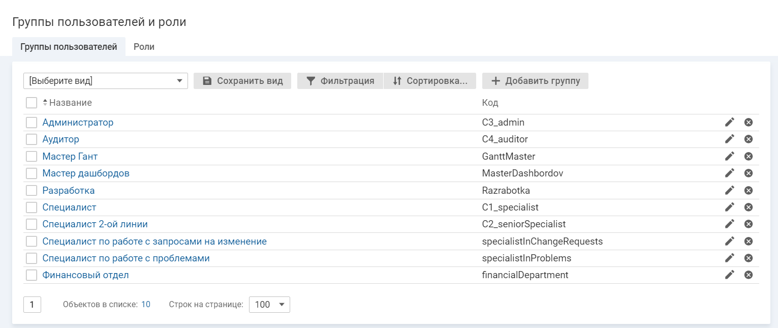 Редактирование группы пользователей выполняется в списке групп и на карточке группы пользователей.