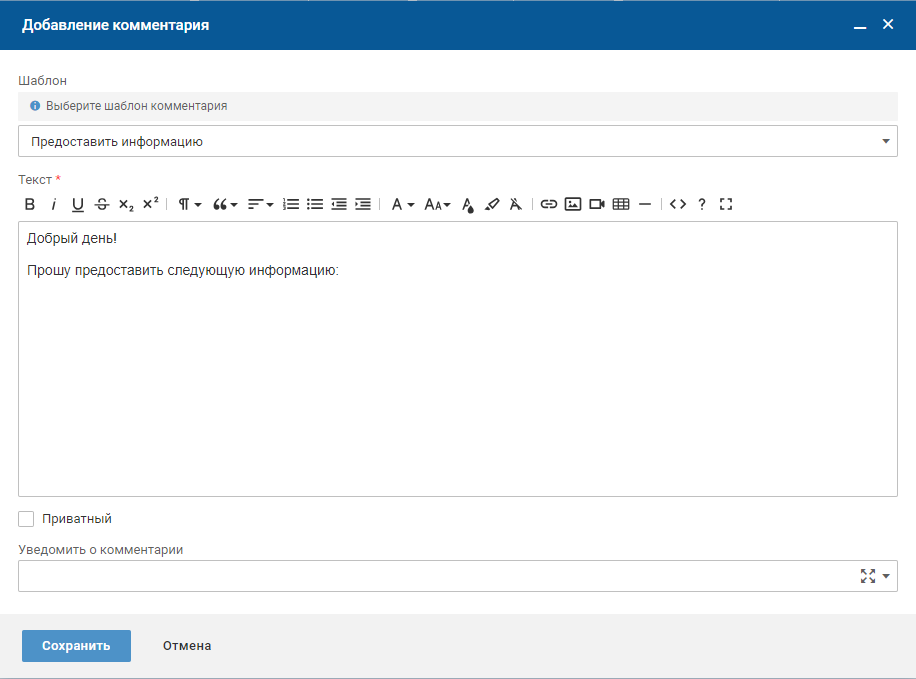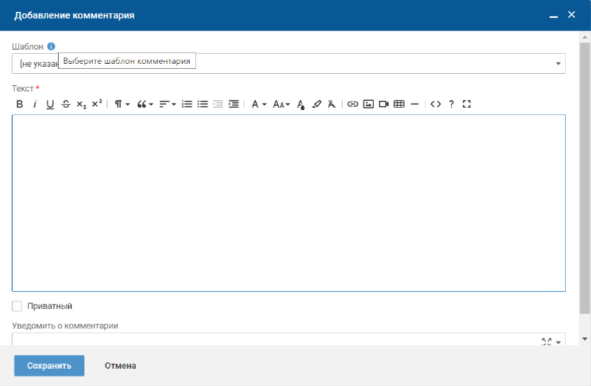 Если описание атрибута служебного класса "Комментарий" (comment) не заполнено, то форма добавления комментария будет отображаться без информационного поля или иконки
