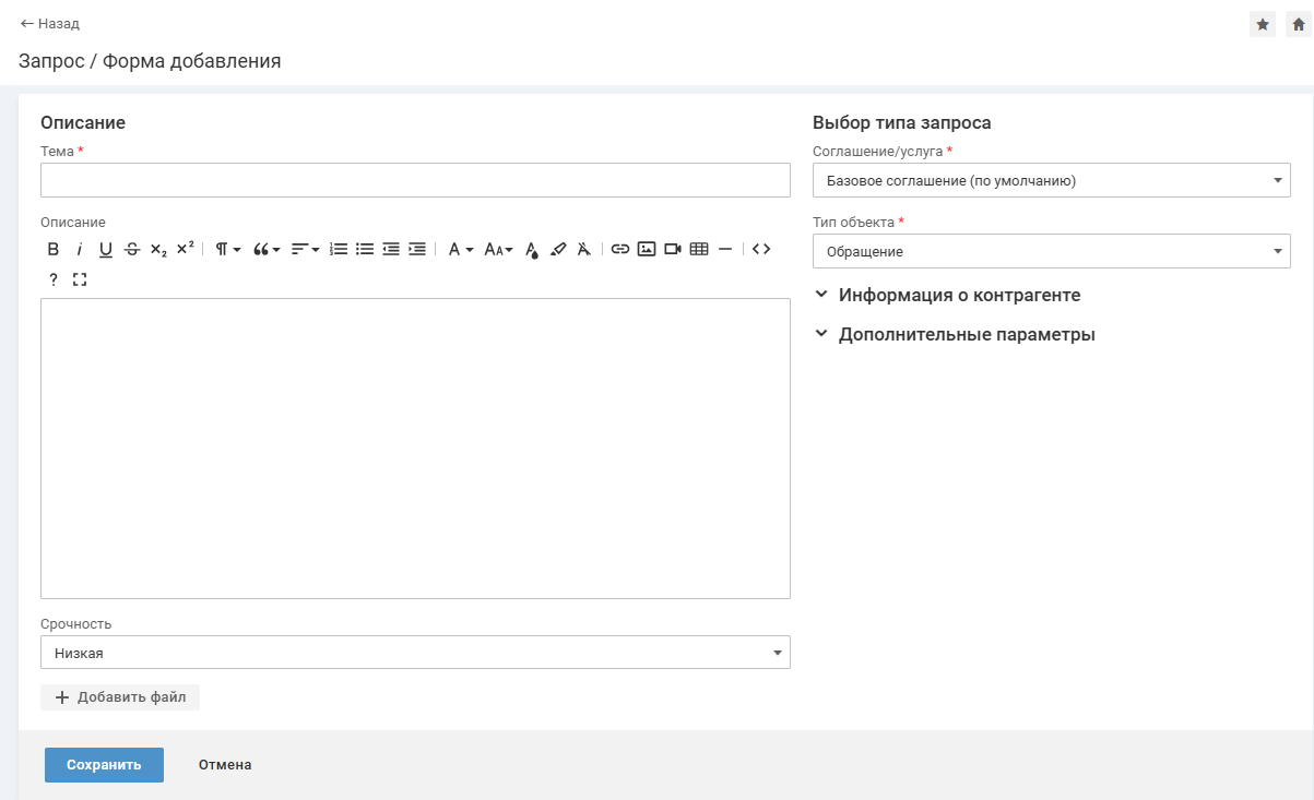 - Заполните остальные поля формы добавления запроса. Поля, обязательные для заполнения, отмечены звездочкой.