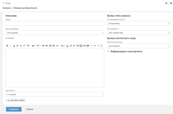 - На форме добавления запроса могут отображаться поля с информацией о контрагенте и других связанных объектах.