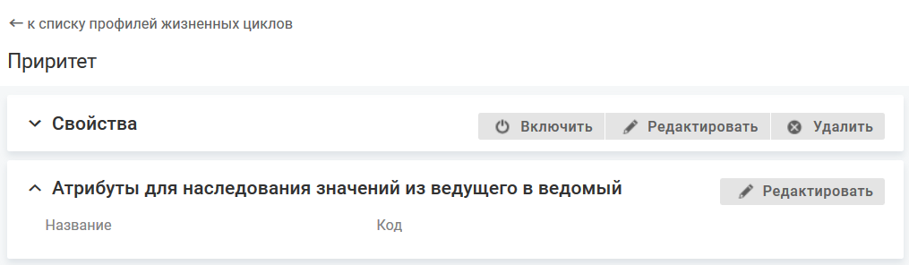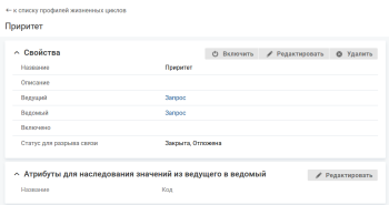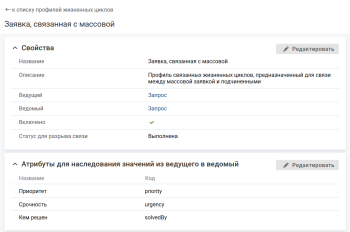 В блоке "Атрибуты для наследования значений из ведущего в ведомый" на карточке профиля отображаются названия и коды атрибутов, значения которых наследуются из ведущего объекта в ведомый с момента связывания и на протяжении всего совместного жизненного цикла, пока связь не будет разорвана.