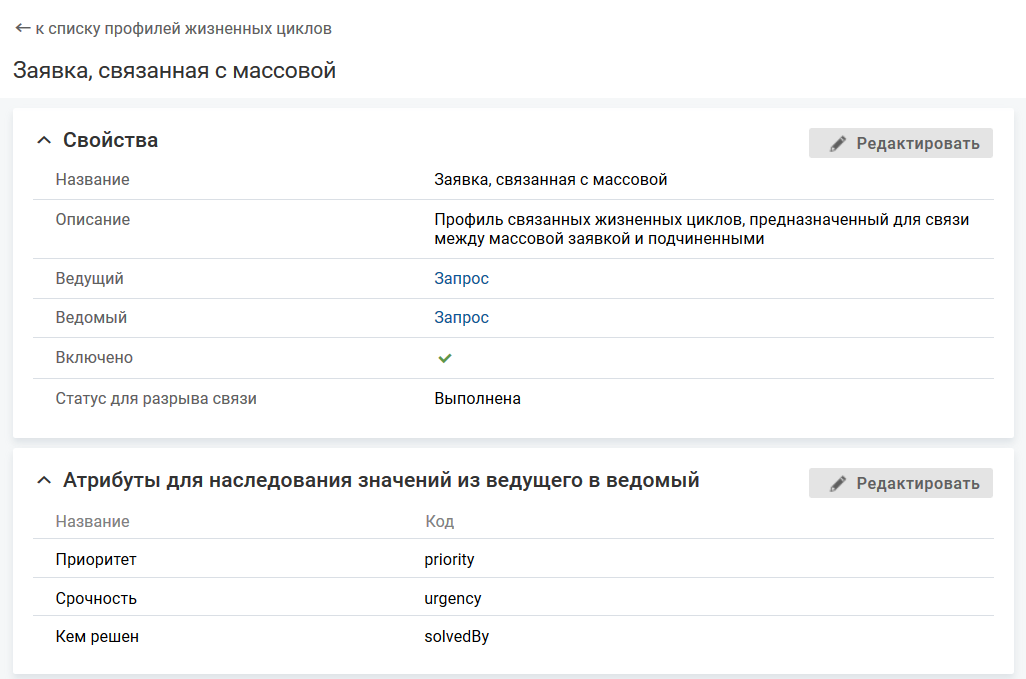 в строке профиля или в карточке профиля связанных жизненных циклов нажмите кнопку Редактировать.На экране откроется форма "Редактирование профиля связанных жизненных циклов".