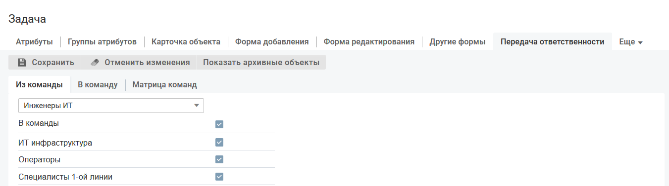 Матрица передачи ответственности между командами размещается в карточке настройки класса/типа объектов на вкладке "Передача ответственности".